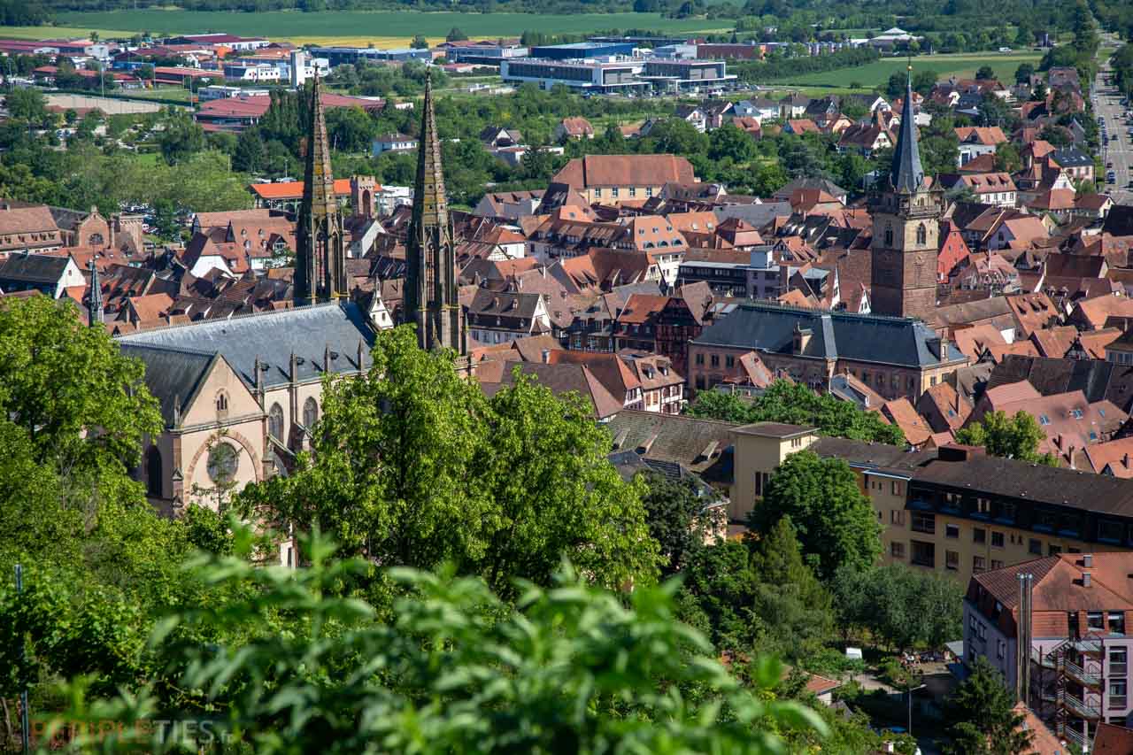 First stop Thann to see the collegiate church of Saint-Thiébaut and the Eye of the Witch. You can admire the vineyards and the town from the Rangen mountain, the only area with volcanic rock.